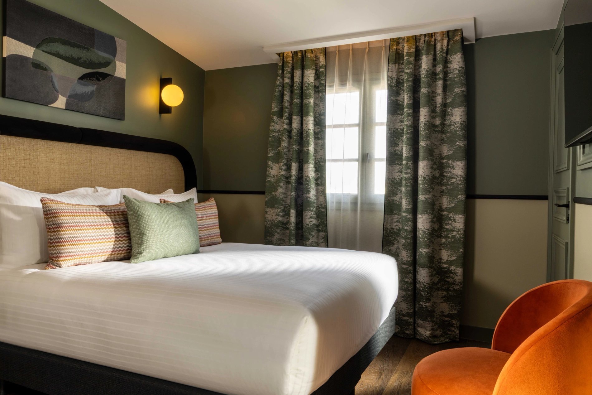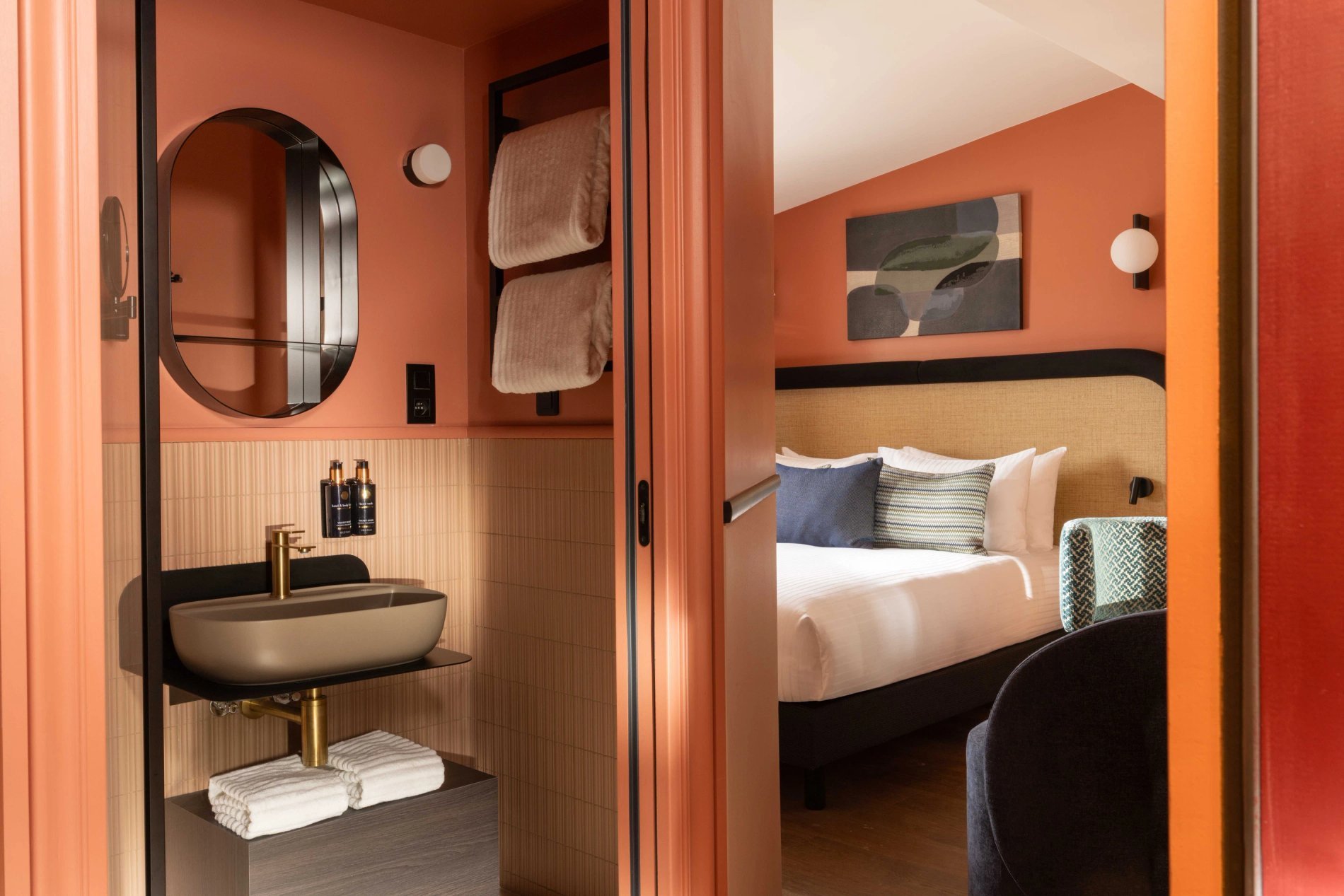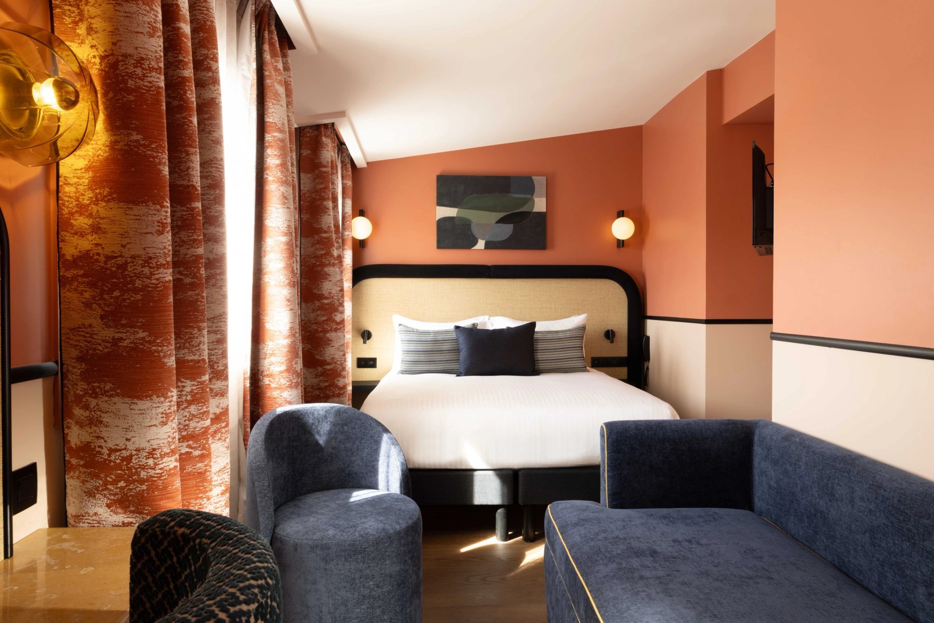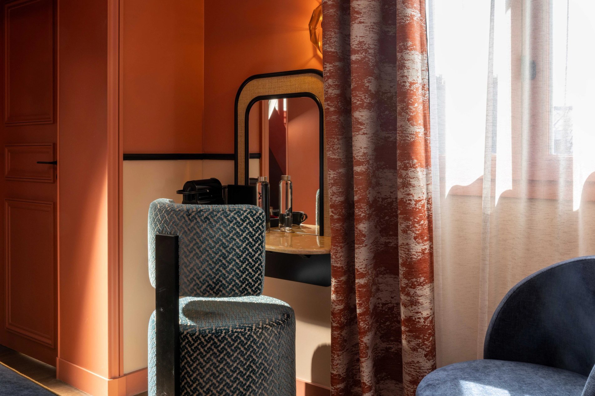 For your rest and serenity, the rooms are perfectly soundproofed and come in three colours to create a soft and refined atmosphere: Terracotta, Bleu de Nimes, or Vert Green Smoke.
