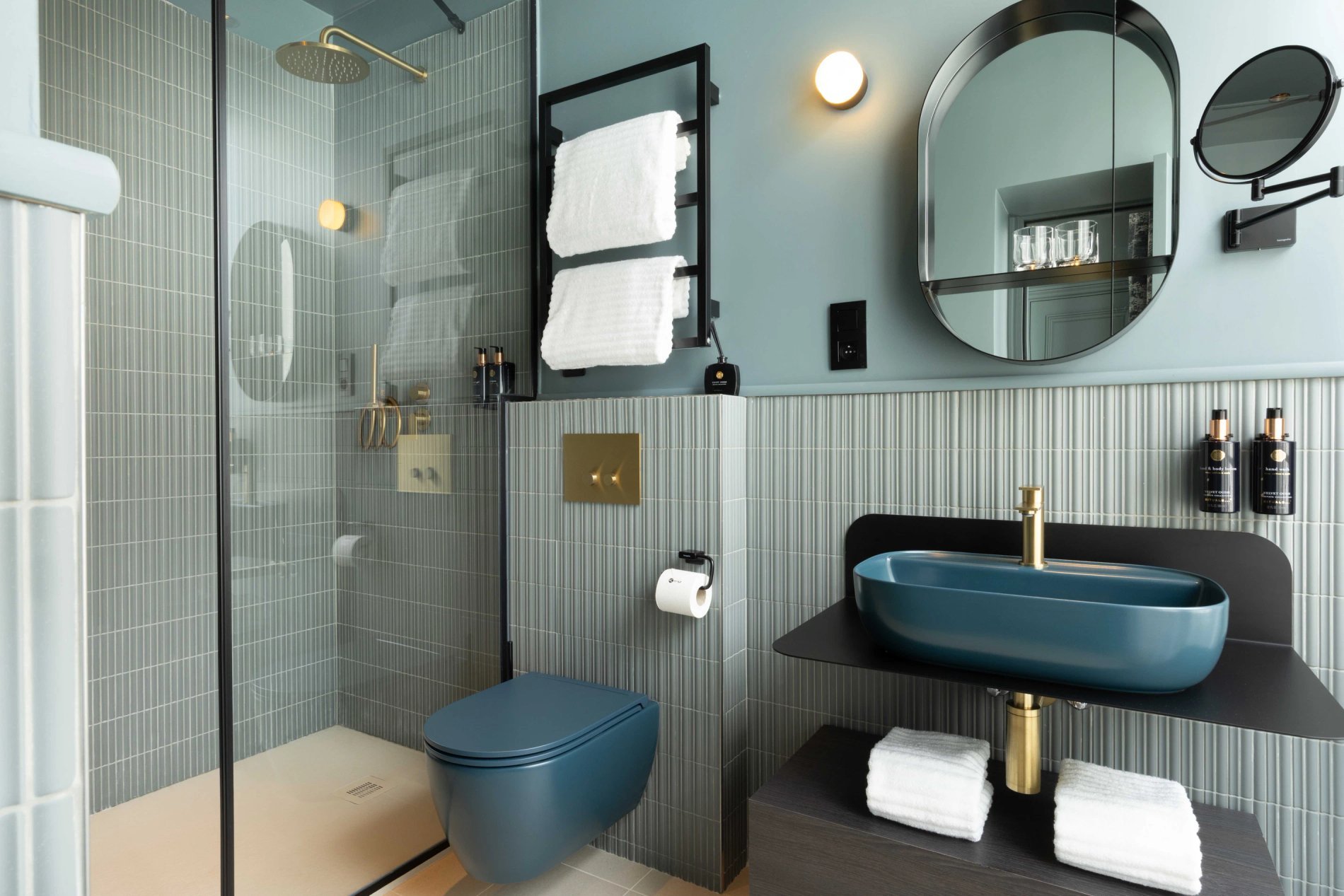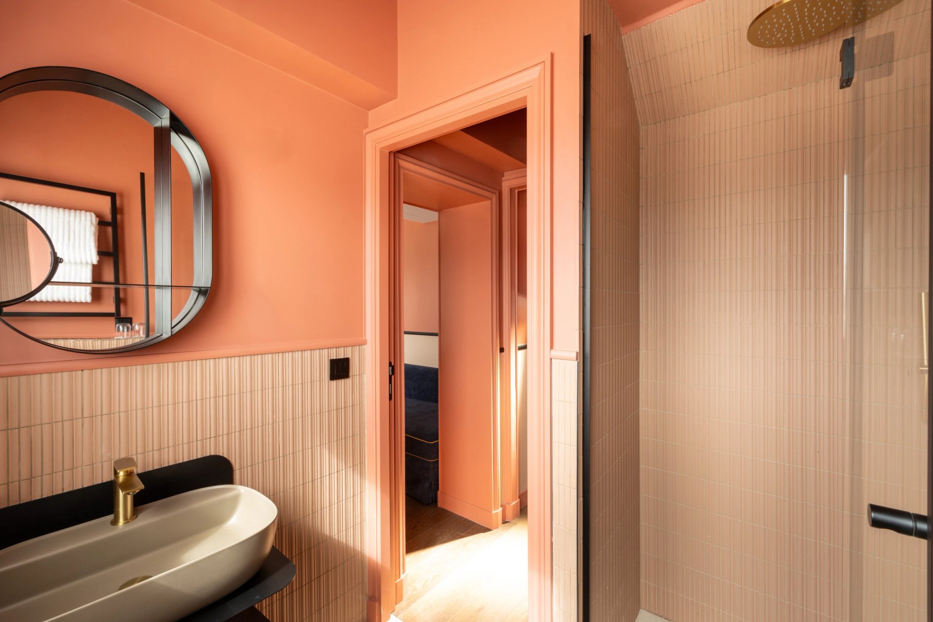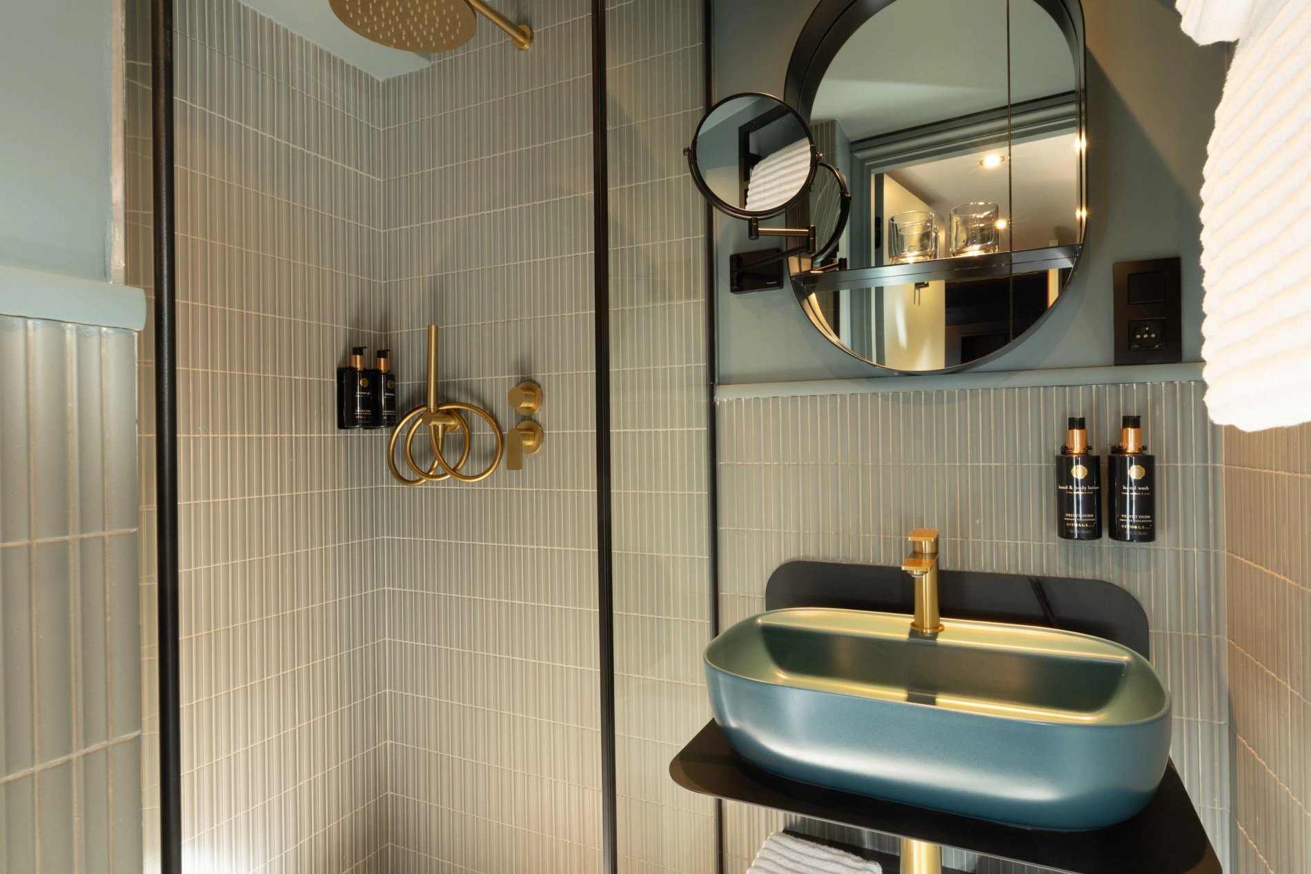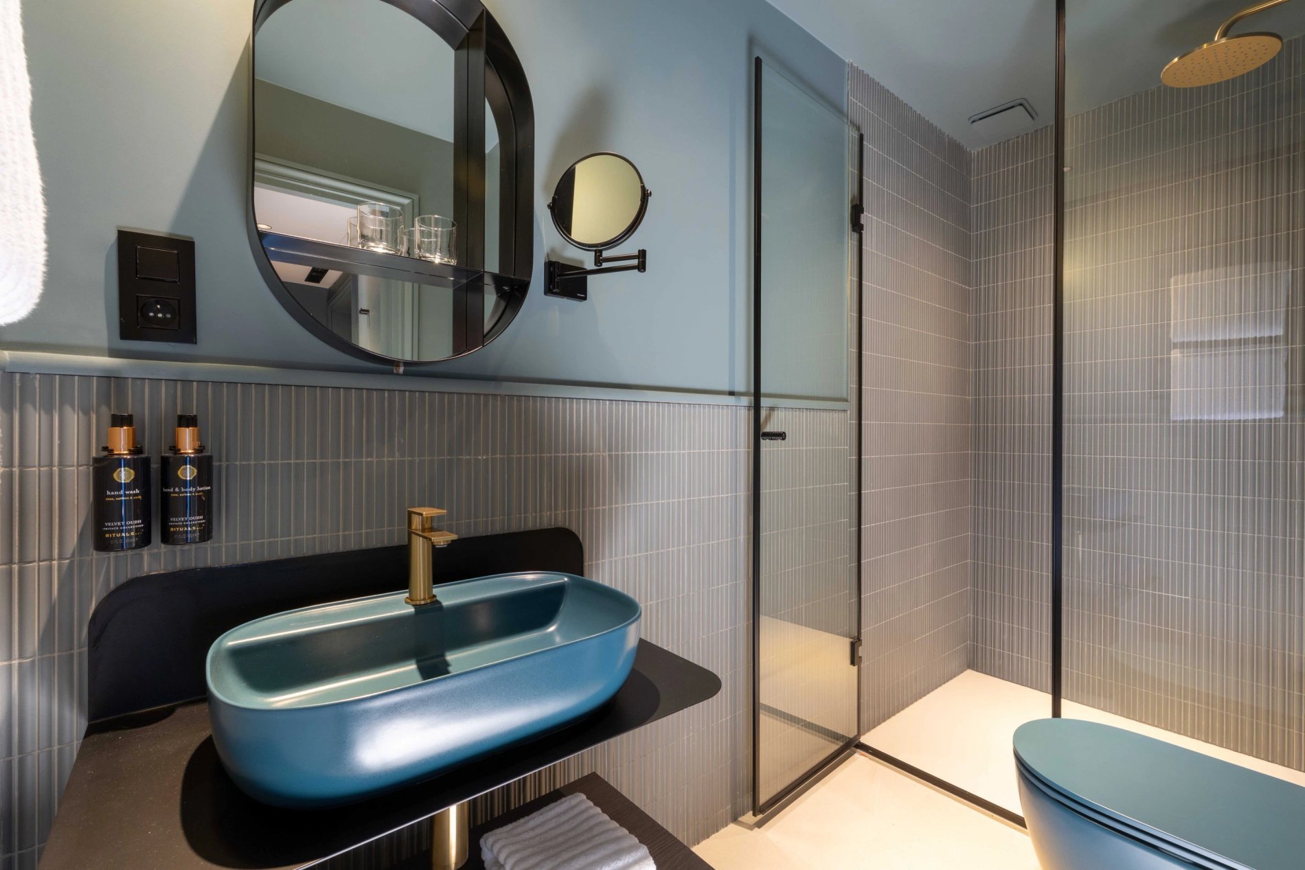 The bathrooms in the rooms, equipped with walk-in showers and Rituals products, invite you to enjoy a moment of well-being.